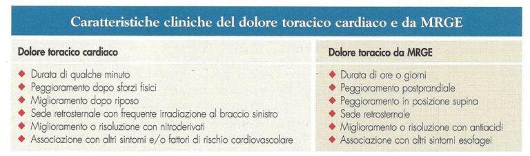 Dolore toracico (rassomiglia ad un dolore infartuale) che si irradia verso l’alto fino al mento e alla mandibola o verso il basso verso l’epigastrio o verso le spalle. Importante distinguerlo dal dolore cardiaco perchè troppo spesso il paziente si reca dal medico pensando di avere un’infarto mentre è solo una GERD.