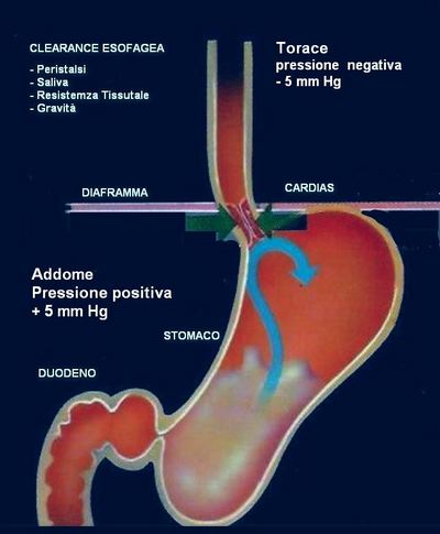 Un ruolo importante nel trasferire il cibo dall’esofago allo stomaco e nell’impedire che questo risalga verso l’alto lo svolge il Cardias (LES ovvero Lower Esophageal Sphinctere) che dovrebbe con la sua chiusura garantire l’impossibilità di questo fenomeno. In condizioni di normalità avviene un suo rilassamento dopo la deglutizione o la distensione del fondo gastrico mantenendo però un tono di base che sovrasta il gradiente pressorio positivo dell’addome rispetto a quello negativo della gabbia toracica che si verifica ad ogni atto respiratorio. Il suo rilassamento produce un passaggio attraverso il LES di succo gastrico. L’esofago si attiva a riportare nello stomaco tale secrezione grazie alle contrazioni peristaltiche e agli altri fattori di protezione. Questo situazione avviene durante la giornata molte volte e senza sintomi.