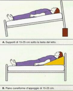 L’innalzamento della testa del letto di circa 15-25 cm. appare molto efficace (non la testa appoggiata a tanti cuscini);
