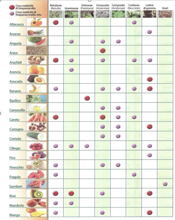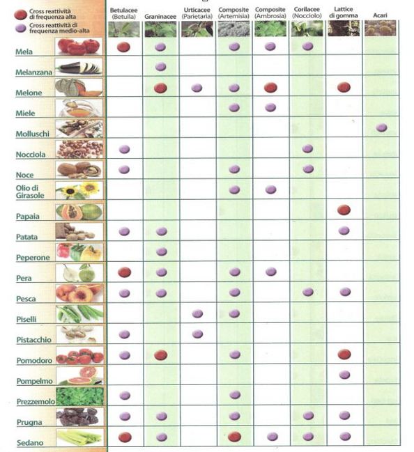 Esiste poi un’interazione tra allergia alimentari e allergie da pollini per cui alcuni alimenti se introdotti durante una fase di pollinosi respiratoria possono provocare una reazione anche alimentare e/o peggiorare il quadro respiratorio. Le tabelle sottostanti evidenziano le interazioni: